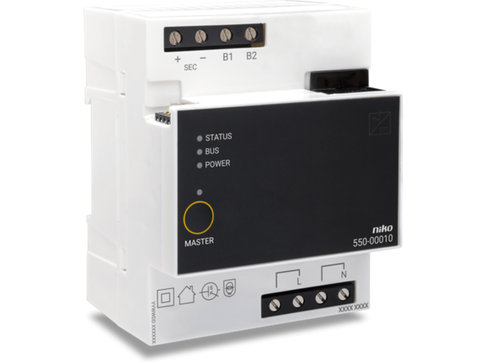 Via deze module worden de modules en bedieningen van de Niko Home Control installatie gevoed. Een led geeft de status en busactiviteit weer. Hoeveel voedingsmodules je voor een bepaalde installatie nodig hebt, vind je terug in de handleiding.