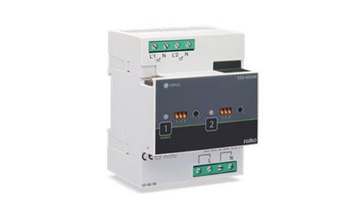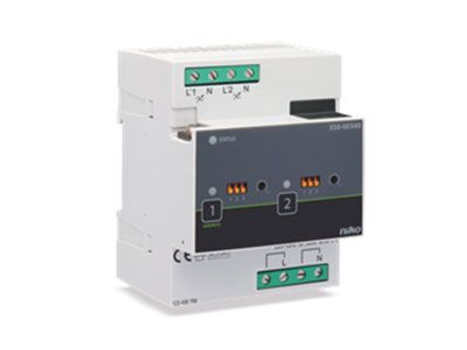 Deze universele dimmodule is een DIN-module met twee kanalen. Ze wordt gebruikt om kringen tot 400 VA (bij 45 °C) of 500 VA (bij 35 °C) te dimmen en is geschikt voor gebruik in combinatie met gloeilampen, 230V- en 12V-halogeenlampen (via transformator), dimbare leds en spaarlampen met een minimumvermogen van 10 VA. Via de drukknoppen op de module kan je de kringen manueel schakelen. Je kan de modules tegen elkaar plaatsen, de voeding en bus worden doorverbonden via een schuifbrug. De module is voorzien van een elektronische beveiliging tegen kortsluiting, overspanning en overstroom.