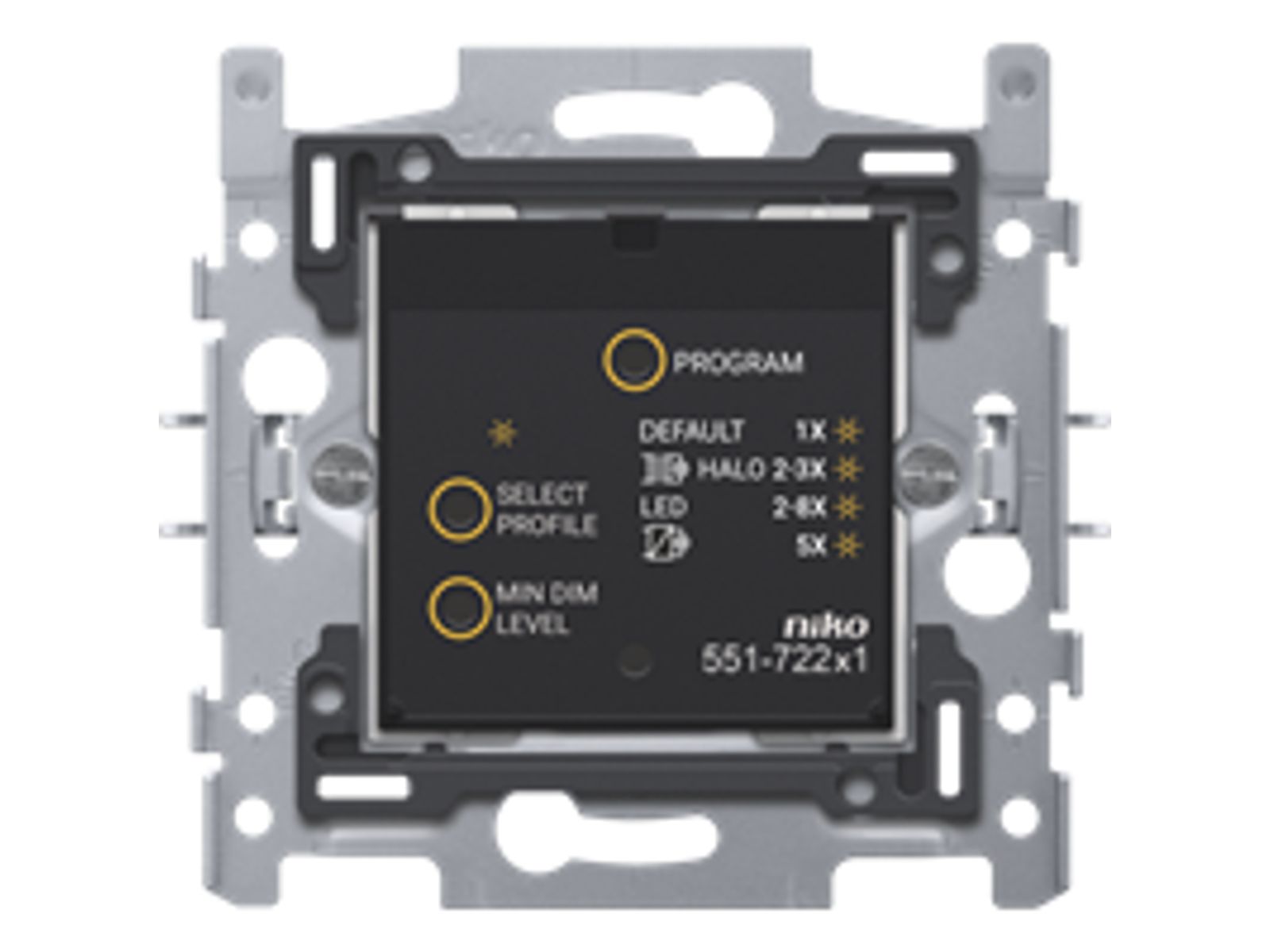 De geconnecteerde dimmer bevat een dimcontact om verlichting te sturen. Hij bevat een zender en ontvanger die draadloos communiceren met de draadloze slimme hub voor Niko Home Control.