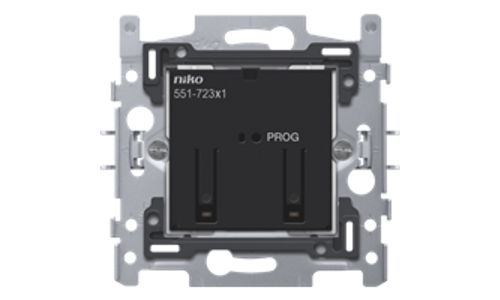 De geconnecteerde motorbediening bevat een schakelcontact om een 230V-gestuurde motor te bedienen. Hij bevat een zender en ontvanger die draadloos communiceren met de draadloze draadloze slimme hub voor Niko Home Control.