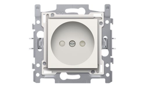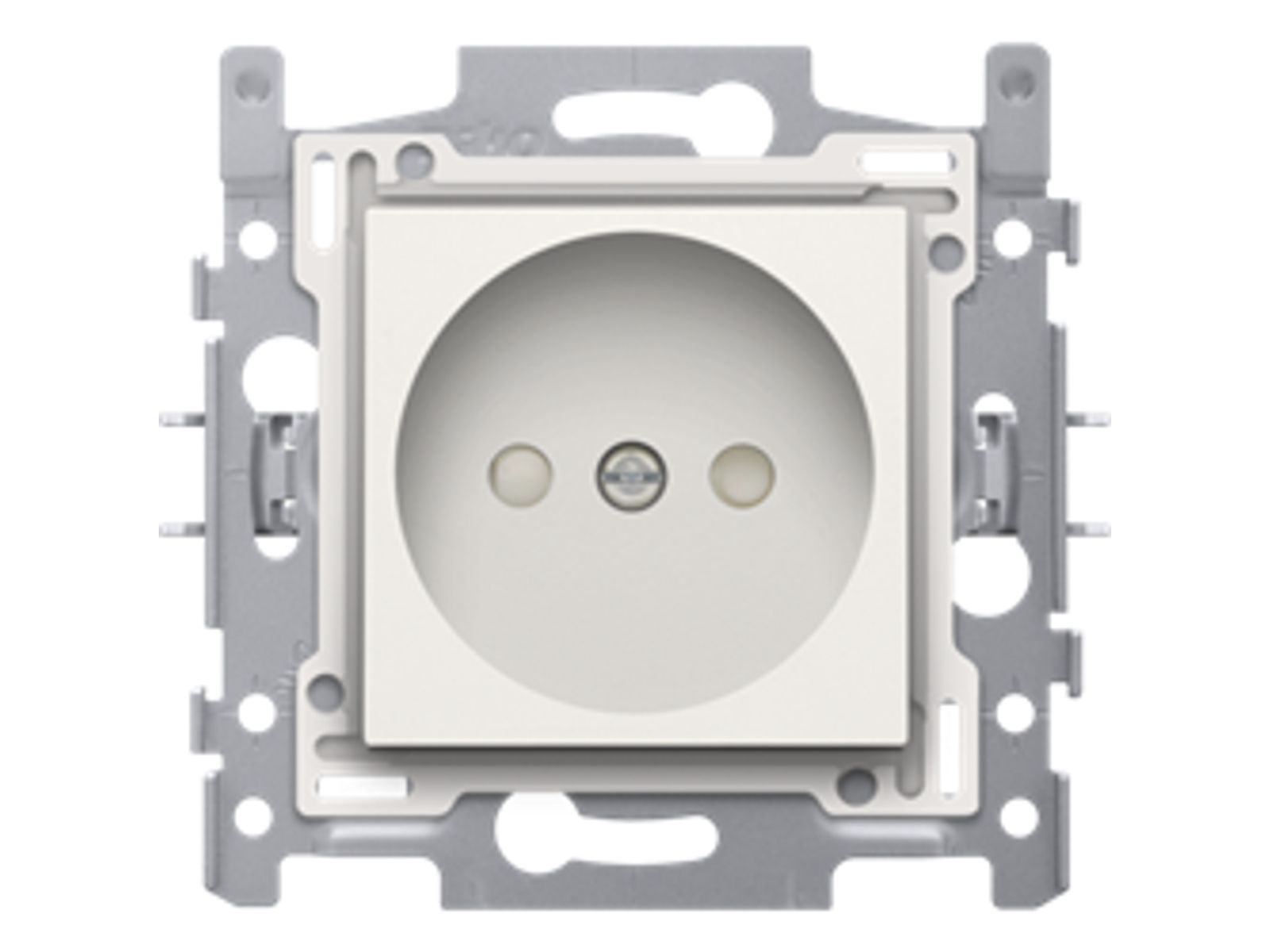 Samengestelde wandcontactdoos (sokkel en afwerkingsset) zonder aarding. De sokkel is uitgerust met insteekklemmen en klauwbevestiging. Het stopcontact heeft ook een beschermingsafsluiters en heeft een inbouwdiepte van 21 mm. Afwerkingskleur: white