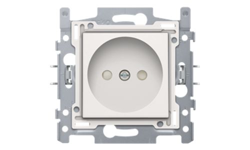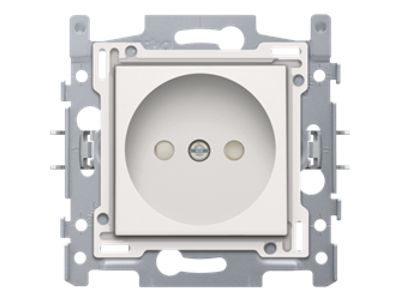 Samengestelde wandcontactdoos (sokkel en afwerkingsset) zonder aarding. De sokkel is uitgerust met schroefklemmen en klauwbevestiging. Het stopcontact heeft ook een beschermingsafsluiters en heeft een inbouwdiepte van 21 mm. Afwerkingskleur: white