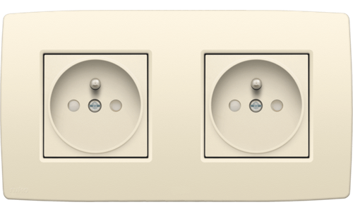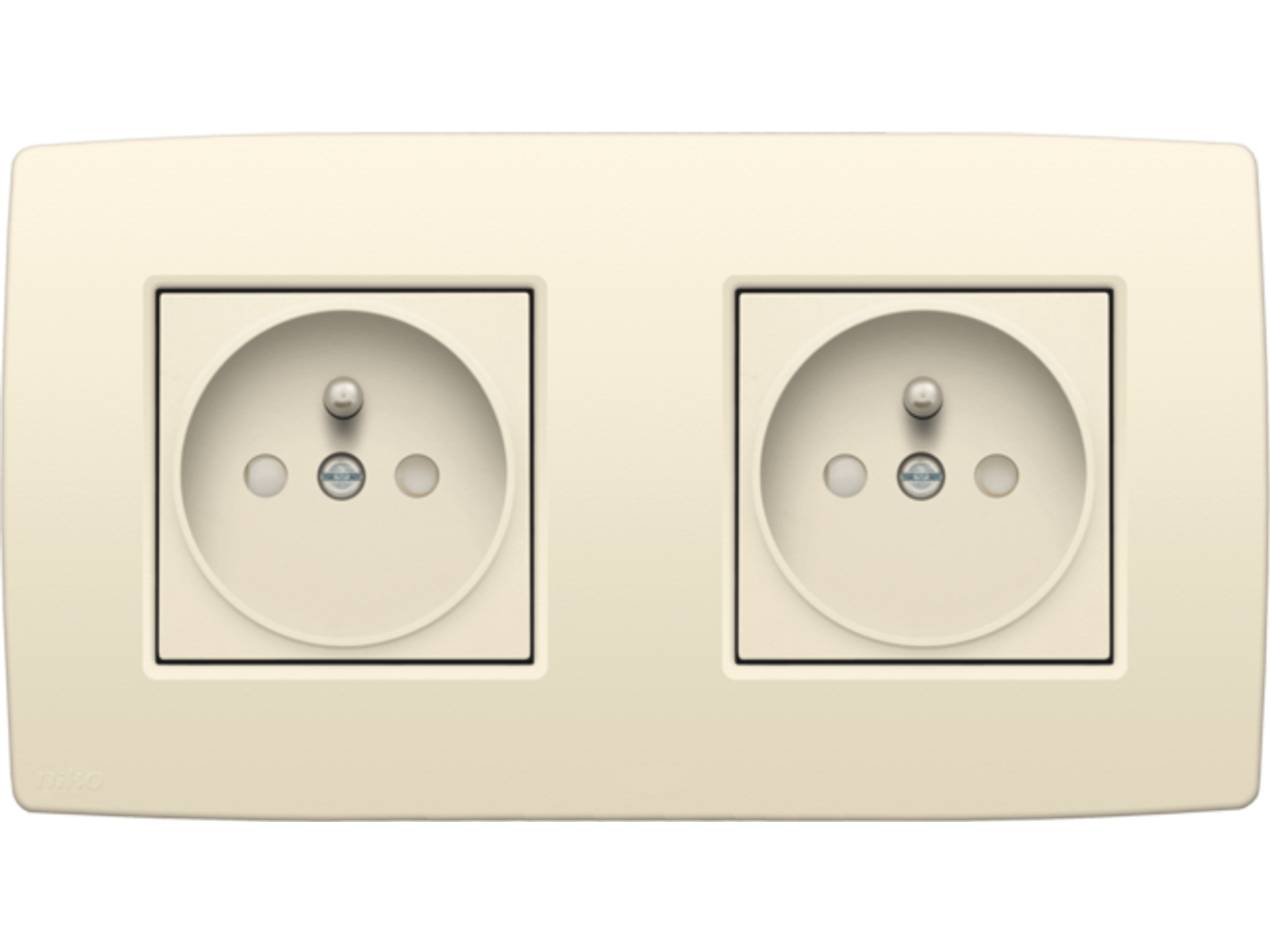Samengestelde dubbele wandcontactdoos met penaarde (sokkel, afwerkingsset en afdekplaat) voor horizontale plaatsing. De sokkels zijn uitgerust met insteekklemmen. Het stopcontact heeft ook een beschermingsafsluiters en heeft een inbouwdiepte van 21 mm. Afwerkingskleur: cream