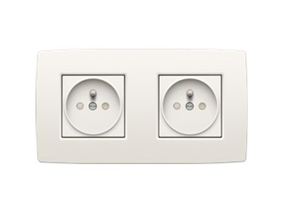 Samengestelde dubbele wandcontactdoos met penaarde (sokkel, afwerkingsset en afdekplaat) voor horizontale plaatsing. De sokkels zijn uitgerust met schroefklemmen. Het stopcontact heeft ook een beschermingsafsluiters en heeft een inbouwdiepte van 21 mm. Afwerkingskleur: white