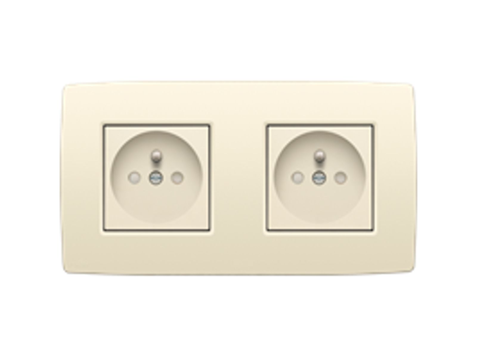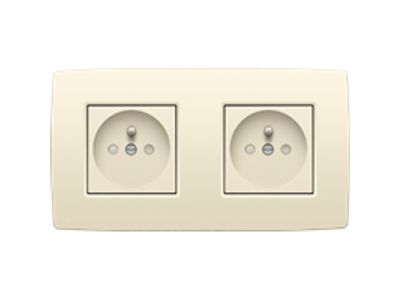 Samengestelde dubbele wandcontactdoos met penaarde dubbele (sokkel, afwerkingsset en afdekplaat) voor horizontale plaatsing. De sokkels zijn uitgerust met insteekklemmen en klauwbevestiging. Het stopcontact heeft ook een beschermingsafsluiters en een inbouwdiepte van 28,5 mm. Afwerkingskleur: cream