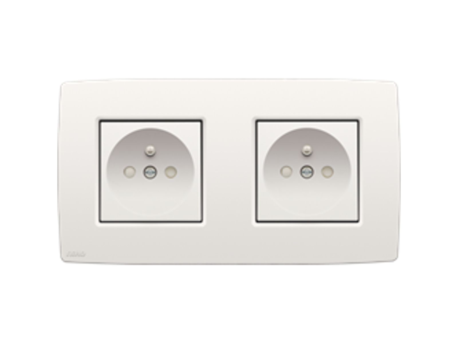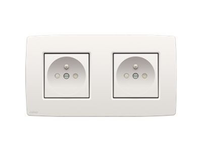 Samengestelde dubbele wandcontactdoos met penaarde (sokkel, centraalplaat en afwerkingsset) voor horizontale plaatsing. De sokkels zijn uitgerust met schroefklemmen en schroefbevestiging. Het stopcontact heeft ook een beschermingsafsluiters en een inbouwdiepte van 28,5 mm. Afwerkingskleur: white