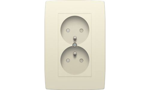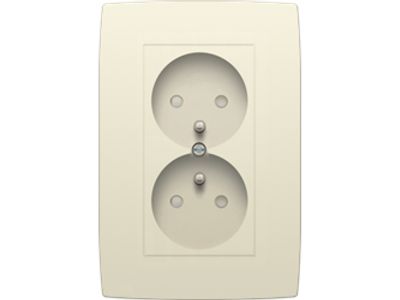 Dubbele inbouwwandcontactdoos 16 A/250 Vac met penaarde en beschermingsafsluiters voor verticale plaatsing met inbouwdiepte 31,5 mm. De afdekplaat wordt op de contactdoos geschroefd. Volledig apparaat incl. afdekplaat en voorgemonteerde afwerkingsset, Afwerkingskleur: cream