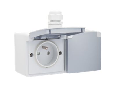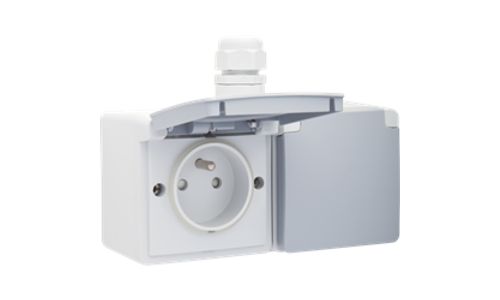 Bij deze horizontale combinatie zijn de twee spuitwaterdichte opbouwwandcontactdozen voorzien van een aardpen, beschermingsafsluiters en insteekklemmen. Beide wandcontactdozen zijn eveneens voorzien van een beschermklep met scharnieren en zijn voorbedraad en gemonteerd in een dubbele spuitwaterdichte opbouwdoos met één ingang bovenaan. Het geheel is spuitwaterdicht wat het uitermate geschikt maakt voor gebruik in vochtige ruimtes en veeleisende omgevingen.Kleurcombinatie: lichtgrijs met donkergrijze beschermklep.