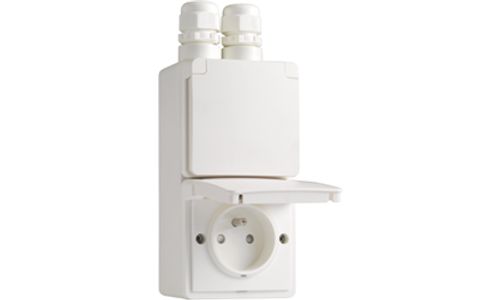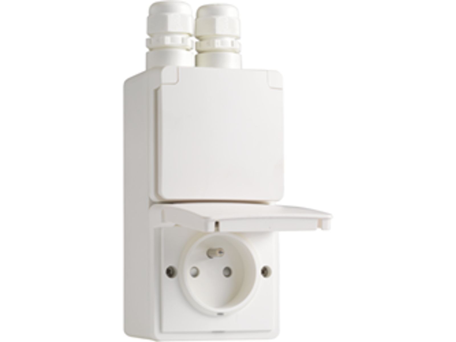 Bij deze verticale combinatie zijn de twee spuitwaterdichte opbouwwandcontactdozen voorzien van een aardpen, beschermingsafsluiters en insteekklemmen. Beide wandcontactdozen zijn eveneens voorzien van een beschermklep met scharnieren en zijn voorbedraad en gemonteerd in een dubbele spuitwaterdichte opbouwdoos met twee ingangen bovenaan. Het geheel is spuitwaterdicht wat het uitermate geschikt maakt voor gebruik in vochtige ruimtes en veeleisende omgevingen. Kleurcombinatie: white.