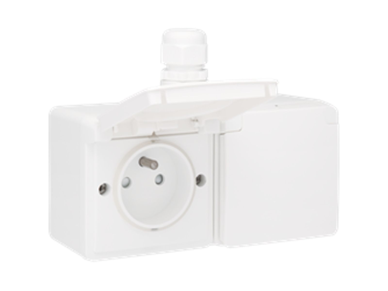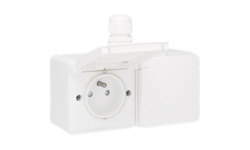 Bij deze horizontale combinatie zijn de twee spuitwaterdichte opbouwwandcontactdozen voorzien van een aardpen, beschermingsafsluiters en schroefklemmen. Beide wandcontactdozen zijn eveneens voorzien van een beschermklep met scharnieren en zijn voorbedraad en gemonteerd in een dubbele spuitwaterdichte opbouwdoos met één ingang bovenaan. Het geheel is spuitwaterdicht wat het uitermate geschikt maakt voor gebruik in vochtige ruimtes en veeleisende omgevingen.Kleurcombinatie: white.