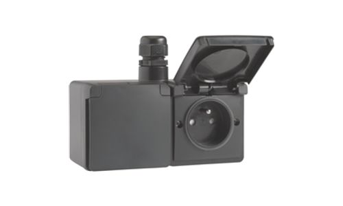 Bij deze horizontale combinatie zijn de twee spuitwaterdichte opbouwwandcontactdozen voorzien van een aardpen, beschermingsafsluiters en schroefklemmen. Beide wandcontactdozen zijn eveneens voorzien van een beschermklep met scharnieren en zijn voorbedraad en gemonteerd in een dubbele spuitwaterdichte opbouwdoos met één ingang bovenaan. Het geheel is spuitwaterdicht wat het uitermate geschikt maakt voor gebruik in vochtige ruimtes en veeleisende omgevingen.Kleurcombinatie: black.