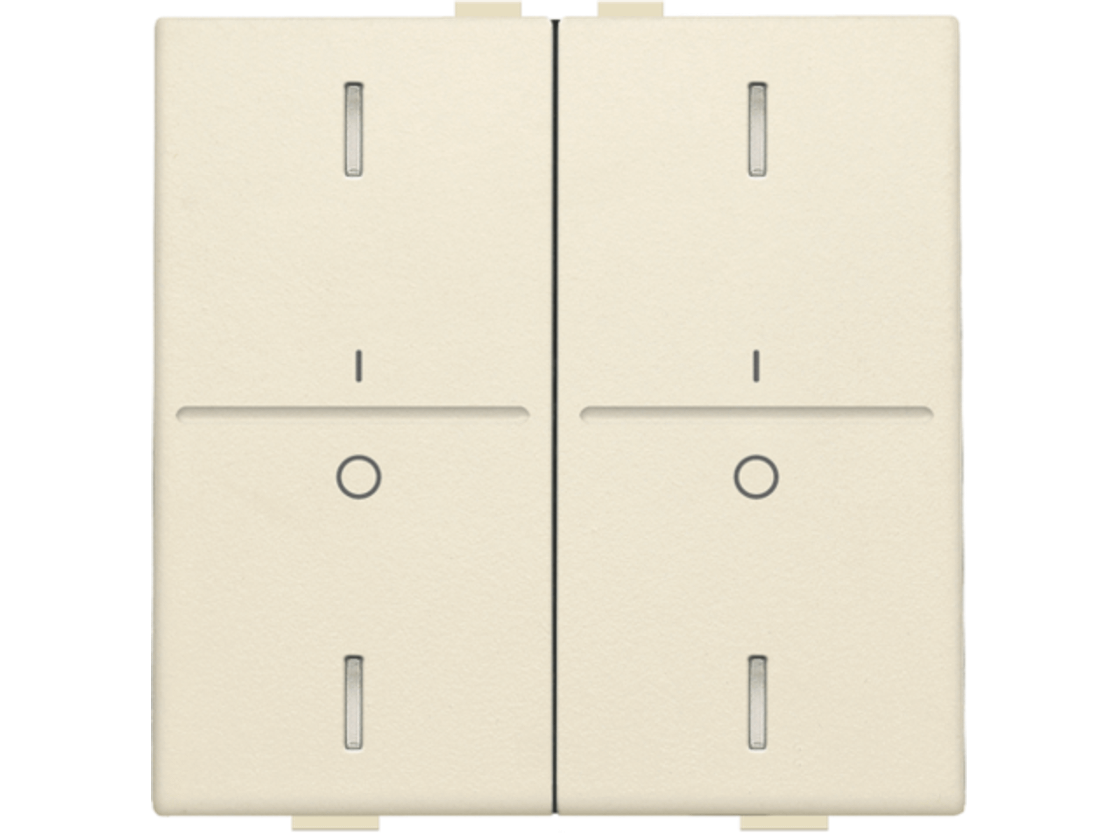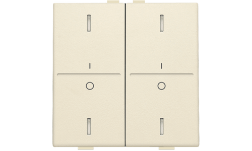 Tweevoudige toets voor een busdrukknop met 4 bedieningsknoppen en 4 feedbackleds. De toets is voorzien van een opdruk 'I' en '0'. Afwerkingskleur: cream.