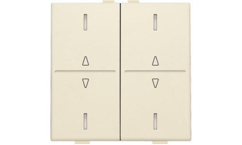 Een tweevoudige toets met Led en symbool 'op' en 'neer', voor een busdrukknop. Het ledlampje duidt aan wanneer een functie al dan niet geactiveerd is. Afwerkingskleur: cream.