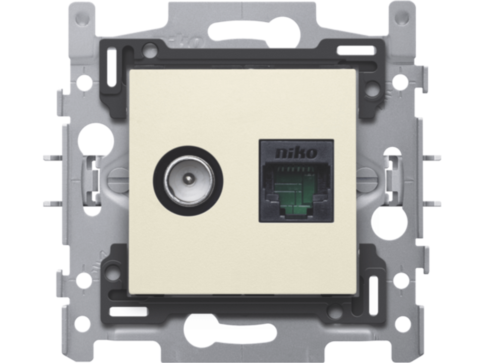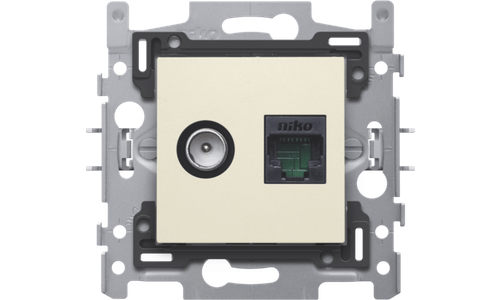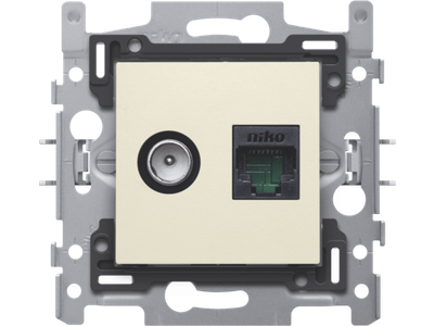 Combinatie coax met RJ45 aansluiting UTP Cat5E, vlakke uitvoering, incl. inbouwraam met sokkel en afwerkingsset cream. Telenet Interkabel en VOO goedgekeurd .