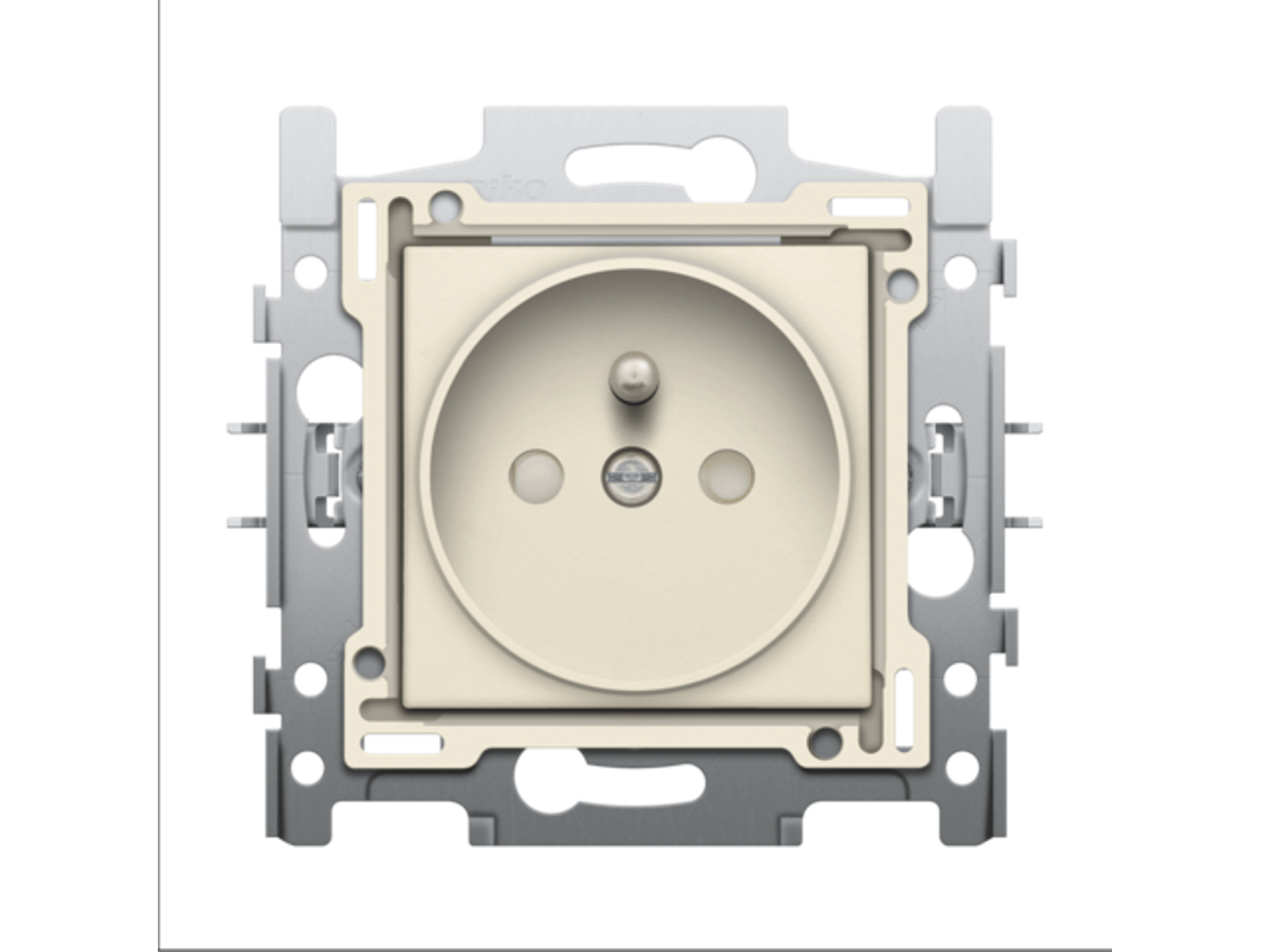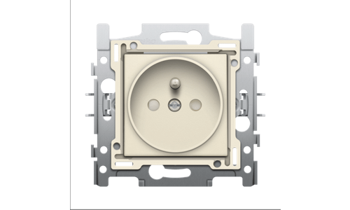 Samengestelde wandcontactdoos met (sokkel en afwerkingsset). De sokkel is uitgerust met schroefklemmen en klauwbevestiging. Het stopcontact heeft ook een beschermingsafsluiters en heeft een inbouwdiepte van 21 mm. Afwerkingskleur: cream