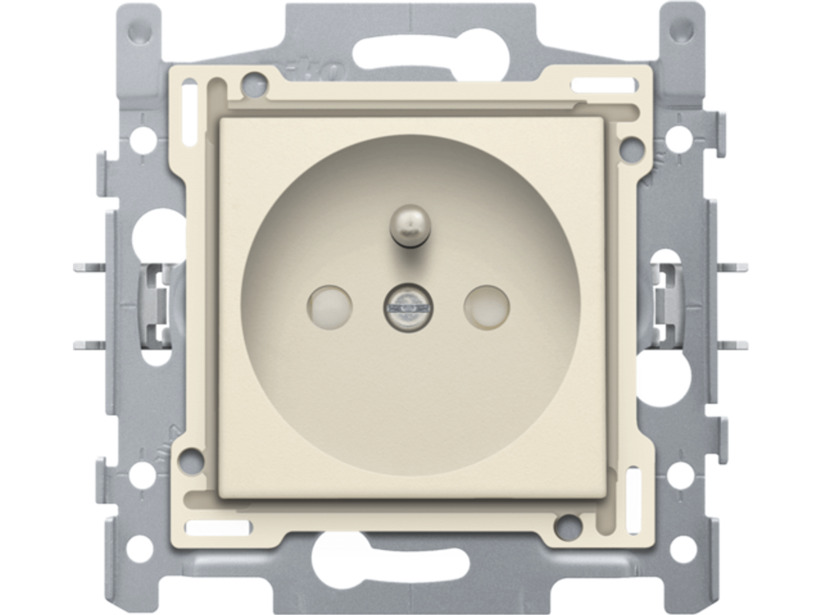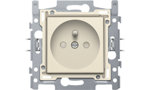 Samengestelde wandcontactdoos met penaarde (sokkel en afwerkingsset). De sokkel is uitgerust met insteekklemmen en klauwbevestiging. Het stopcontact heeft ook een beschermingsafsluiters en heeft een inbouwdiepte van 28,5 mm. Afwerkingskleur: cream