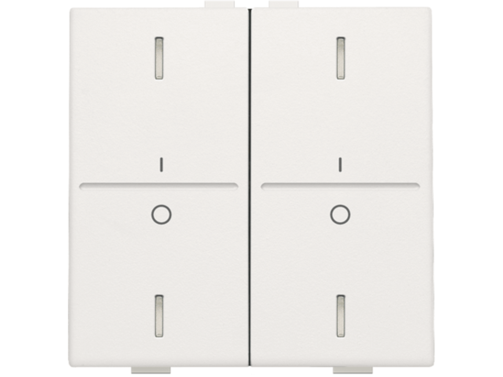 Tweevoudige toets voor een busdrukknop met 4 bedieningsknoppen en 4 feedbackleds. De toets is voorzien van een opdruk 'I' en '0'. Afwerkingskleur: white.