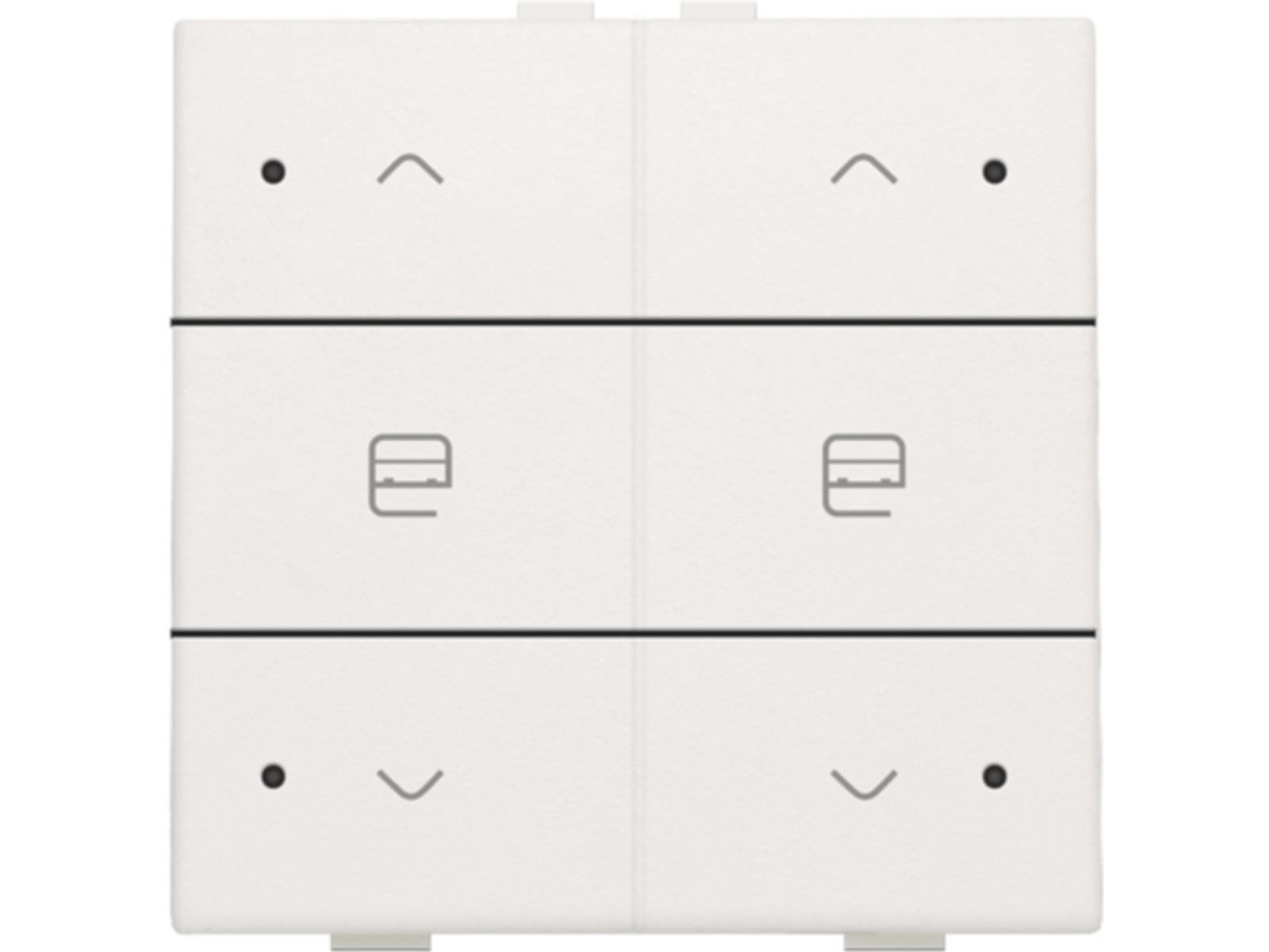 Met deze drukknop stuur je twee groepen van rolluiken, gordijnen of zonweringen. Hij wordt via een klikmechanisme op de muurprint bevestigd. Een led geeft aan in welke positie het rolluik, het gordijn of de zonwering zicht bevindt. Mechanisme inclusief toets. Afwerkingskleur: white.