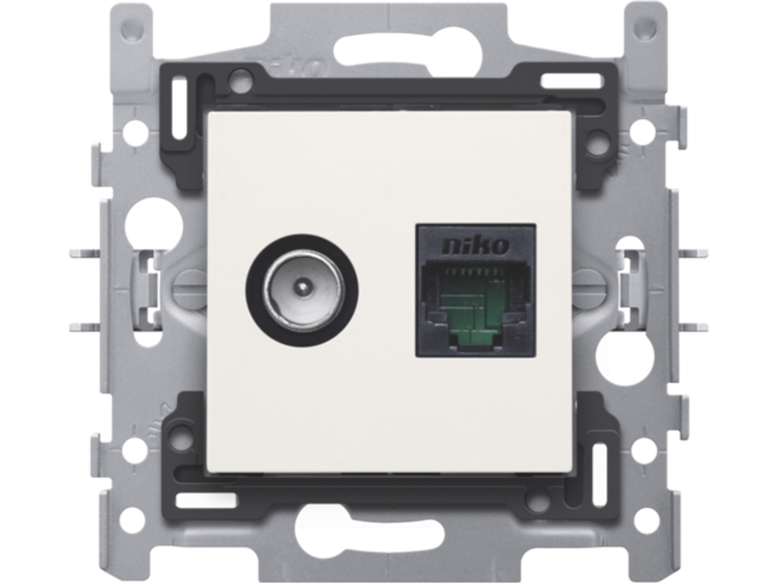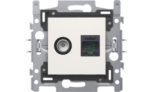 Combinatie coax met RJ45 aansluiting UTP Cat5E, vlakke uitvoering, incl. inbouwraam met sokkel en afwerkingsset white. Telenet Interkabel en VOO goedgekeurd