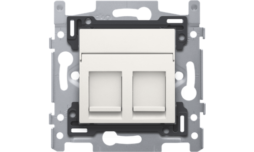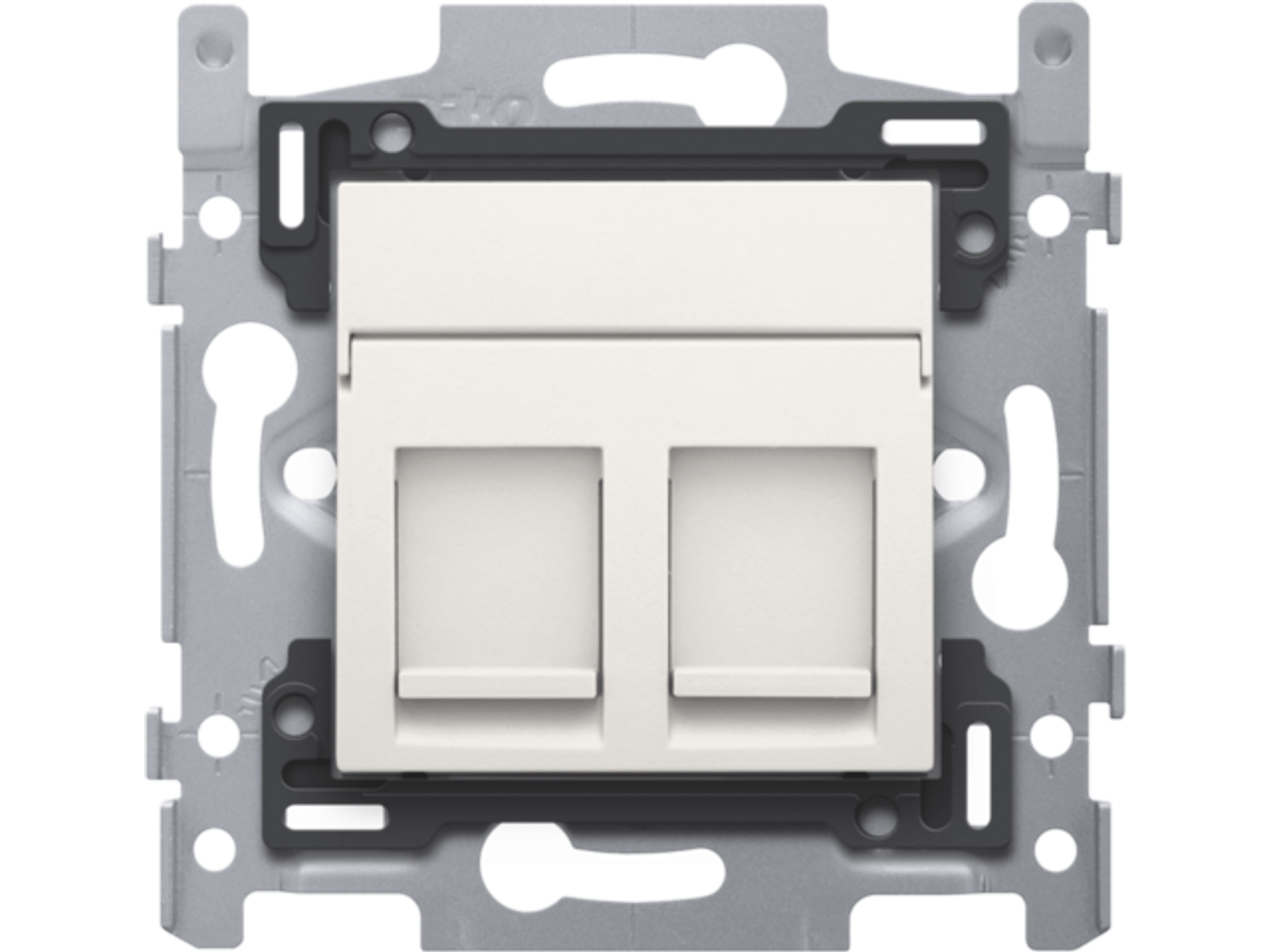 Samengestelde wandcontactdoos (sokkel en afwerkingsset) met 2 RJ45-aansluitpunten cat. 5E UTP voor het maken van een netwerkverbinding met 2 apparaten voor telefonie, Ethernet, IP of internettoepassingen. Alle aansluitpunten van het mechanisme worden in sterconfiguratie aangesloten op de centrale aansluitkast met behulp van een kabel van hetzelfde performantietype. Afwerkingskleur: white
