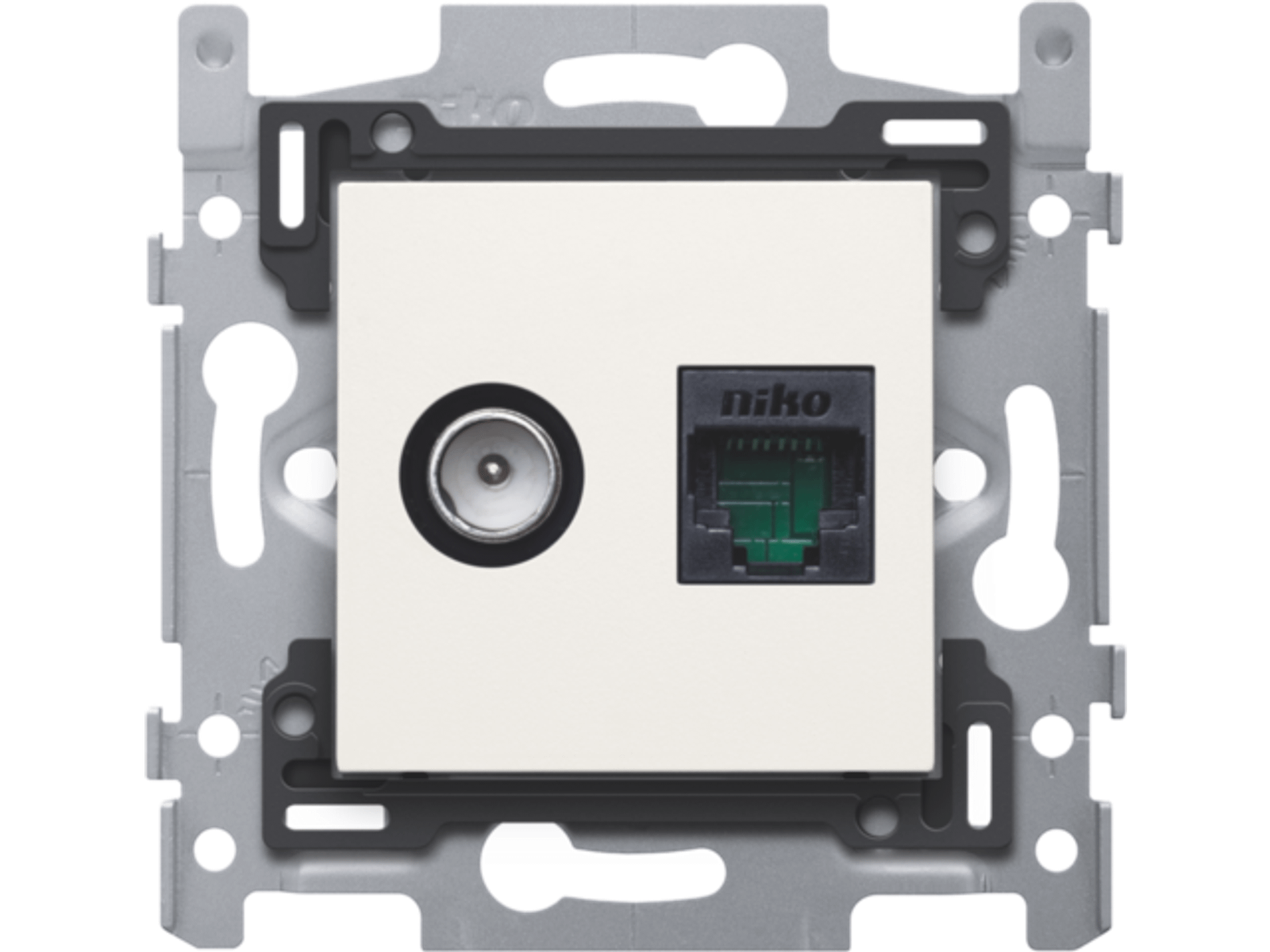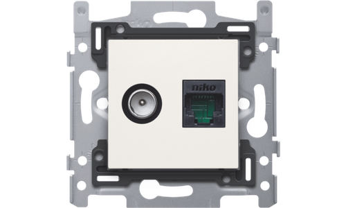 Combinatie coax met RJ45 aansluiting UTP Cat6, vlakke uitvoeringsokkel en afwerkingsset white. Goedgekeurd Telenet Interkabel en VOO