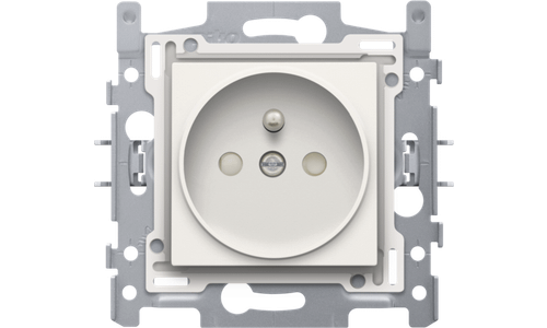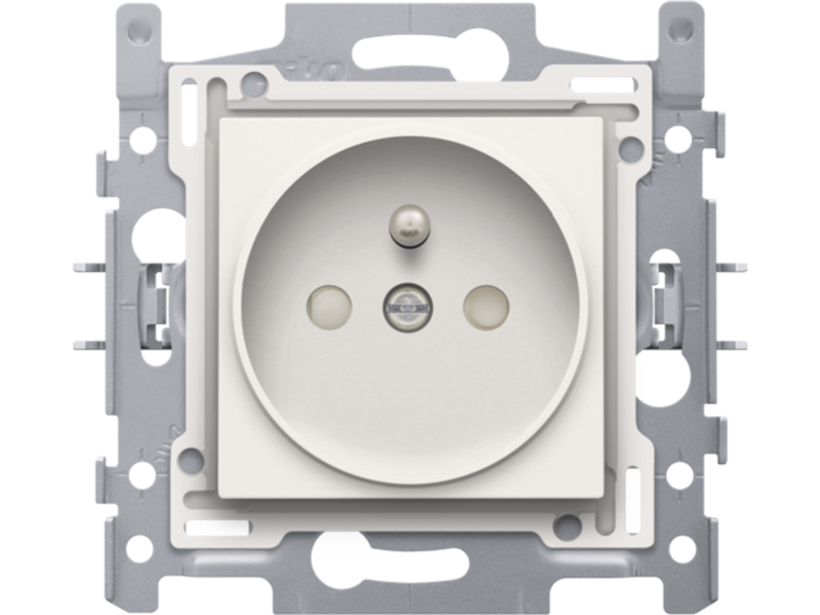 Samengestelde wandcontactdoos met (sokkel en afwerkingsset). De sokkel is uitgerust met schroefklemmen en klauwbevestiging. Het stopcontact heeft ook een beschermingsafsluiters en heeft een inbouwdiepte van 21 mm. Afwerkingskleur: white