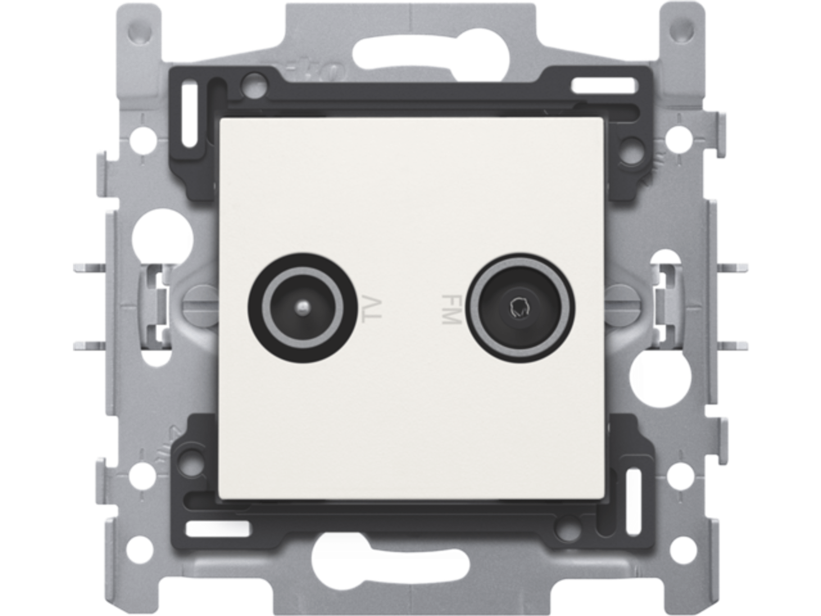 Samengestelde contactdoos (sokkel en afwerkingsset). De sokkel is uitgerust met schroefbevestiging. De contactdoos heeft 1 ingang voor een meervoudige coaxaansluiting GEDU TV en 1 ingang voor FM aansluiting. De ingangen zijn aangeduid respectievelijk met een TV icoon en FM icoon. Afwerkingskleur: white
