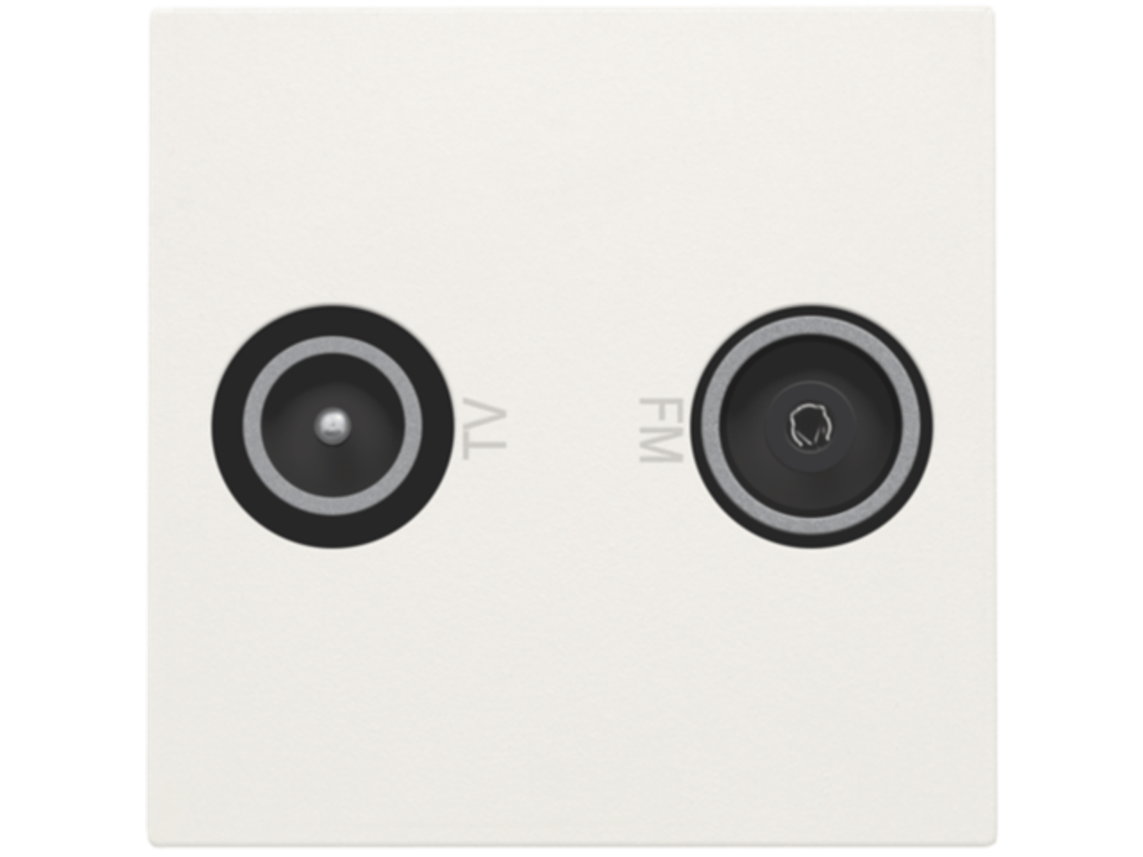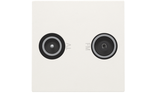 Afwerkingsset voor een mechanisme met 2x meervoudige coaxaansluiting voor tv en FM. Naast de ingangen staat de opdruk 'tv' en 'FM'. Deze centraalplaat is geschikt voor inbouw in installatiekanalen of in spatwaterdicht schakelmateriaal.