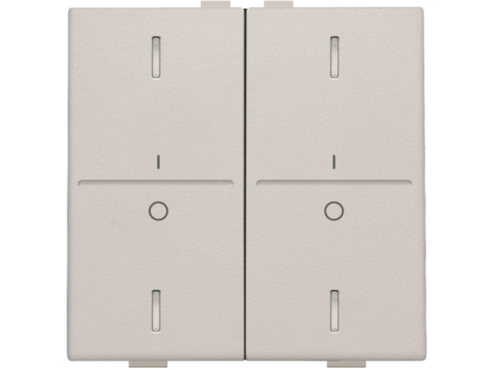 Tweevoudige toets voor een busdrukknop met 4 bedieningsknoppen en 4 feedbackleds. De toets is voorzien van een opdruk 'I' en '0'. Afwerkingskleur: light grey.