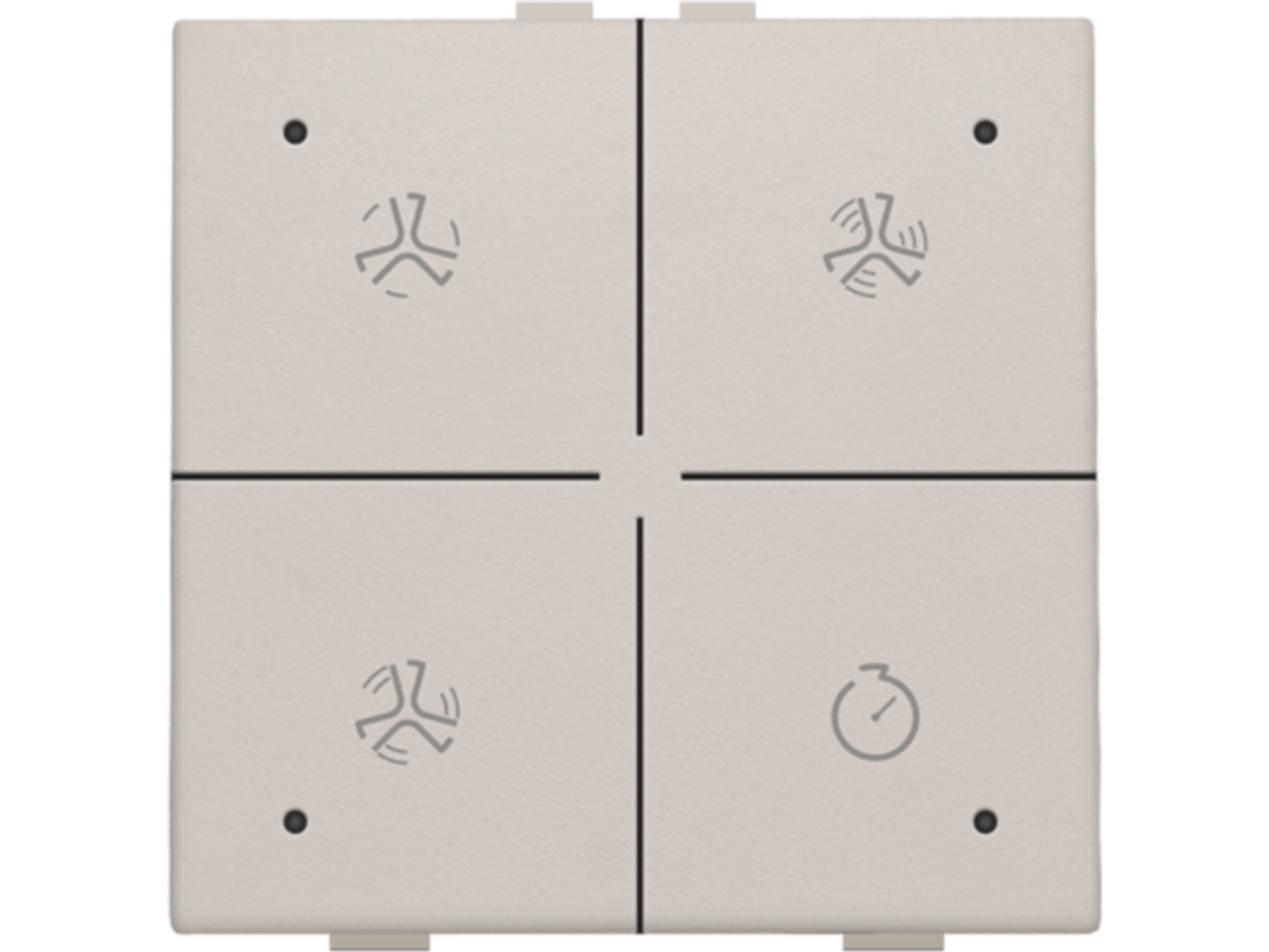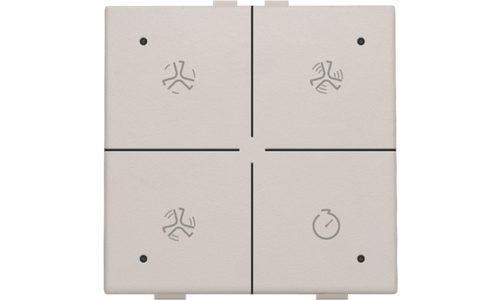 Met deze drukknop stel je vier ventilatiestanden in. Hij wordt via een klikmechanisme op de muurprint bevestigd. Een led geeft aan in welke stand de ventilatie staat. Mechanisme inclusief toets. Afwerkingskleur: light grey.