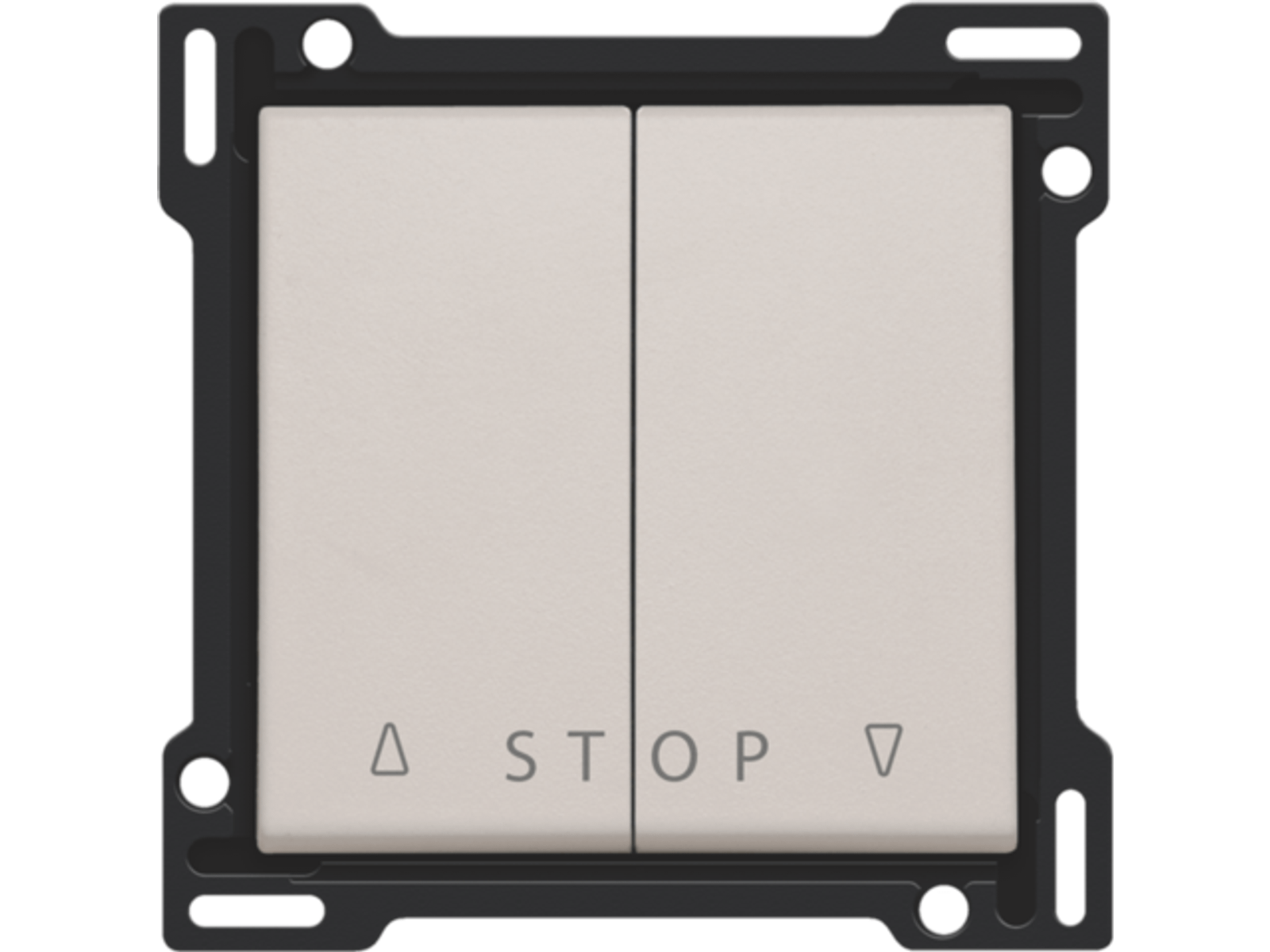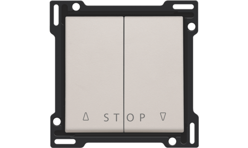 Centraalplaat met 2 toetsen voor electronische rolluiksturing via drukknop. De eerste toets heeft een 'omhoog' functie met stop. Met de tweede toets kan je de rolluiken of zonneweringen omlaag sturen met een stopfunctie. Afwerkingskleur: light grey.