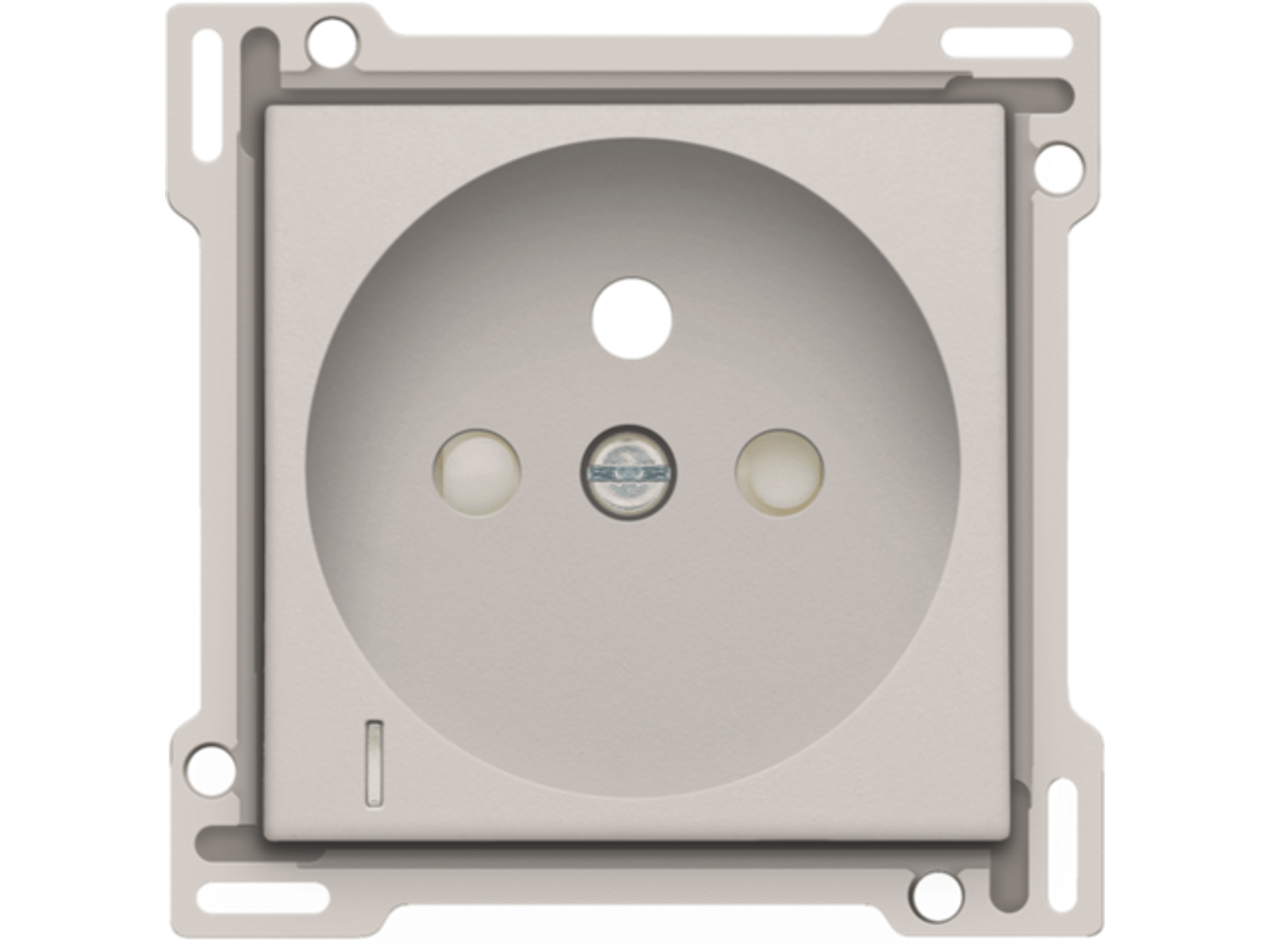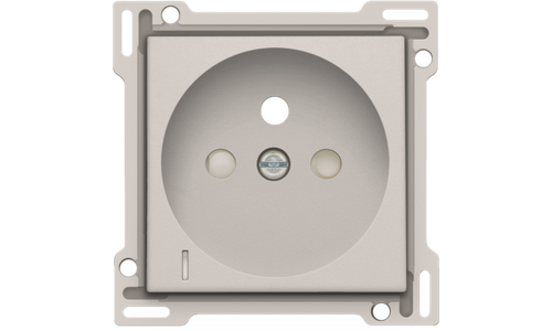 Centraalplaat voor inbouwstopcontact met penaarde, beschermingsafsluiters en klapdeksel. Deze centraalplaat dient gebruikt te worden op een stopcontact met spanningsaanduiding en met een inbouwdiepte van 28,5mm. Afwerkingskleur: light grey.