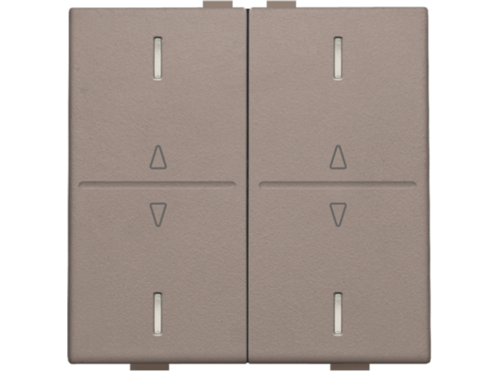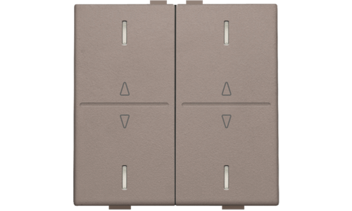 Een tweevoudige toets met Led en symbool 'op' en 'neer', voor een busdrukknop. Het ledlampje duidt aan wanneer een functie al dan niet geactiveerd is. Afwerkingskleur: greige.