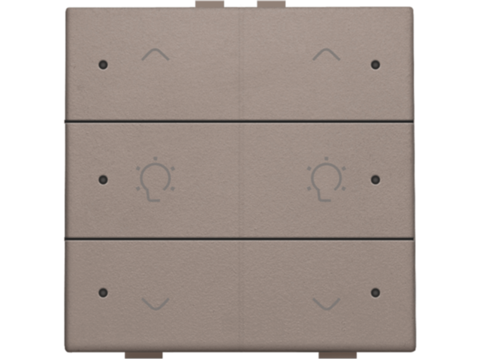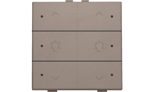 Met deze drukknop dim je twee lichtpunten of lichtkringen. Hij wordt via een klikmechanisme op de muurprint bevestigd. Een led geeft aan of het licht op- of neergedimd is. Mechanisme inclusief toets. Afwerkingskleur: greige.