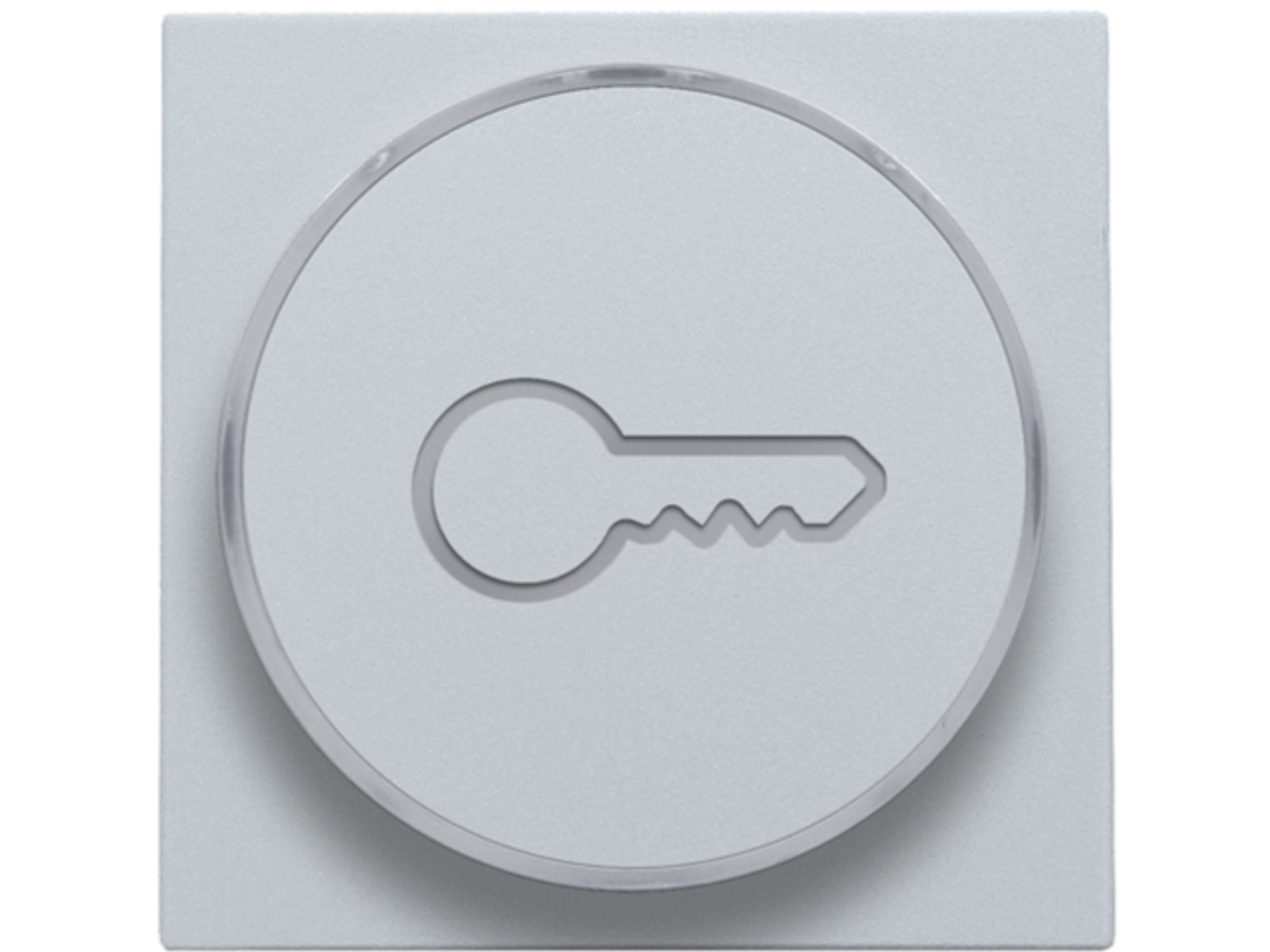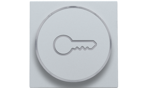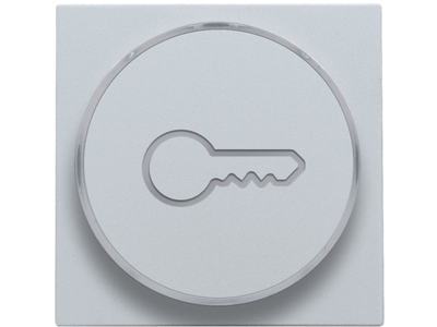 Centraalplaat met doorschijnende ring voor drukknop. De zijring met sleutelicoon laat toe dat de amberkleurige led aangeeft wanneer het licht geactivieerd is. Het kan ook als een soort signaallamp gebruikt worden. Afwerkingskleur: sterling.
