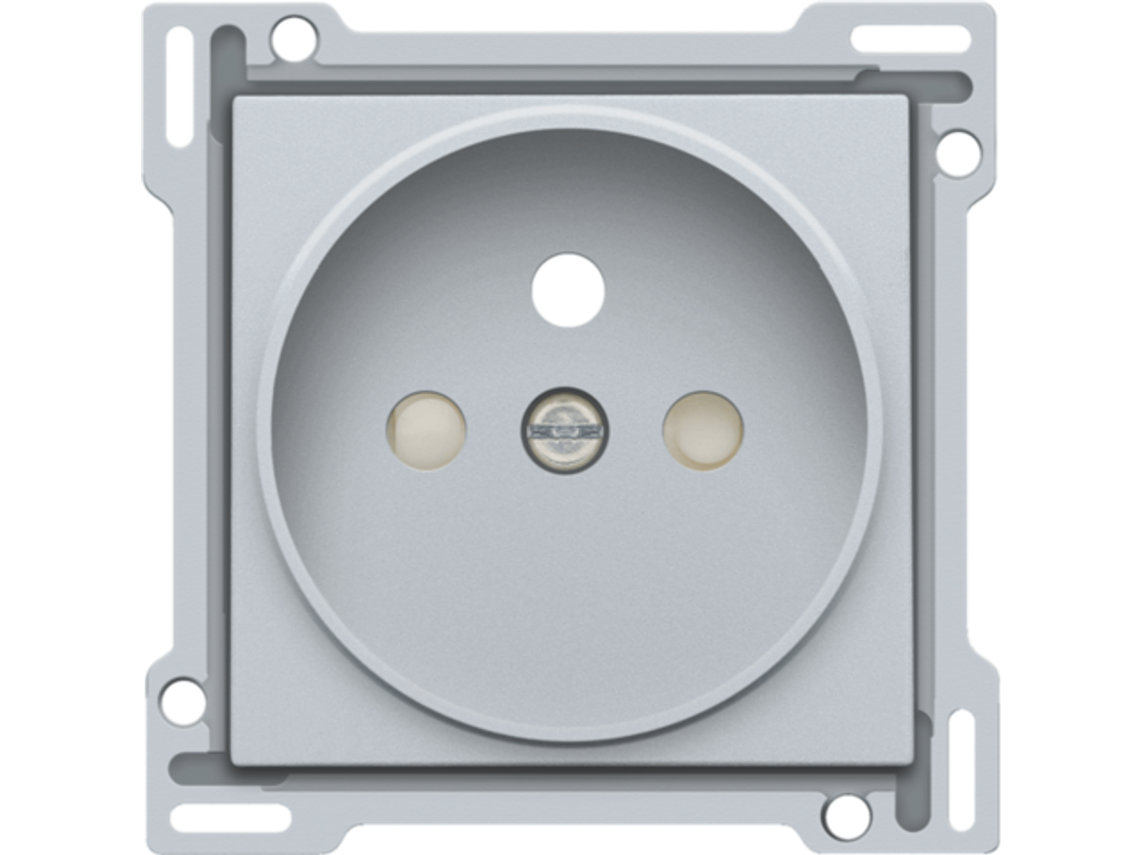 Centraalplaat voor inbouwstopcontact met penaarde en beschermingsafsluiters. Deze centraalplaat dient gebruikt te worden op een stopcontact met inbouwdiepte van 21mm. Afwerkingskleur: sterling.