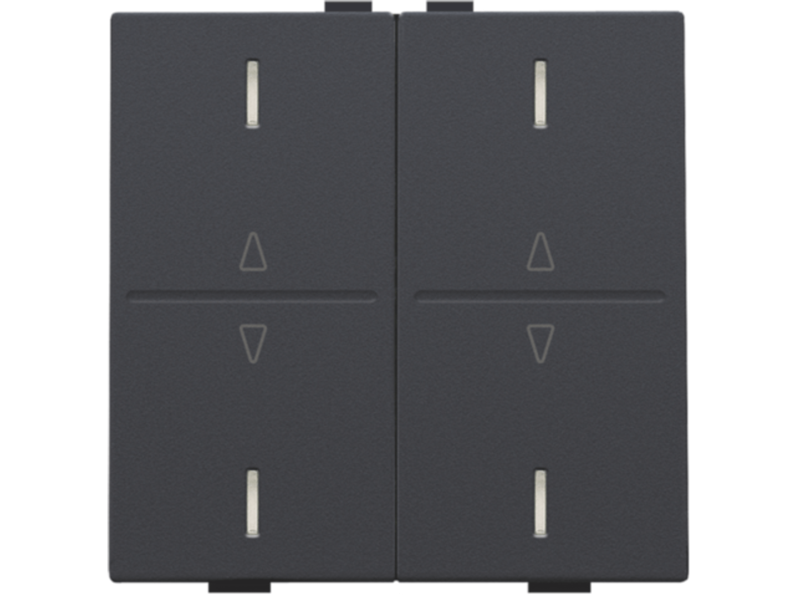 Een tweevoudige toets met Led en symbool 'op' en 'neer', voor een busdrukknop. Het ledlampje duidt aan wanneer een functie al dan niet geactiveerd is. Afwerkingskleur: anthracite.
