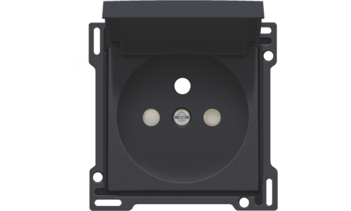 Centraalplaat voor inbouwstopcontact met penaarde, beschermingsafsluiters en klapdeksel. Deze centraalplaat dient gebruikt te worden op een stopcontact met inbouwdiepte van 28,5mm. Afwerkingskleur: anthracite.