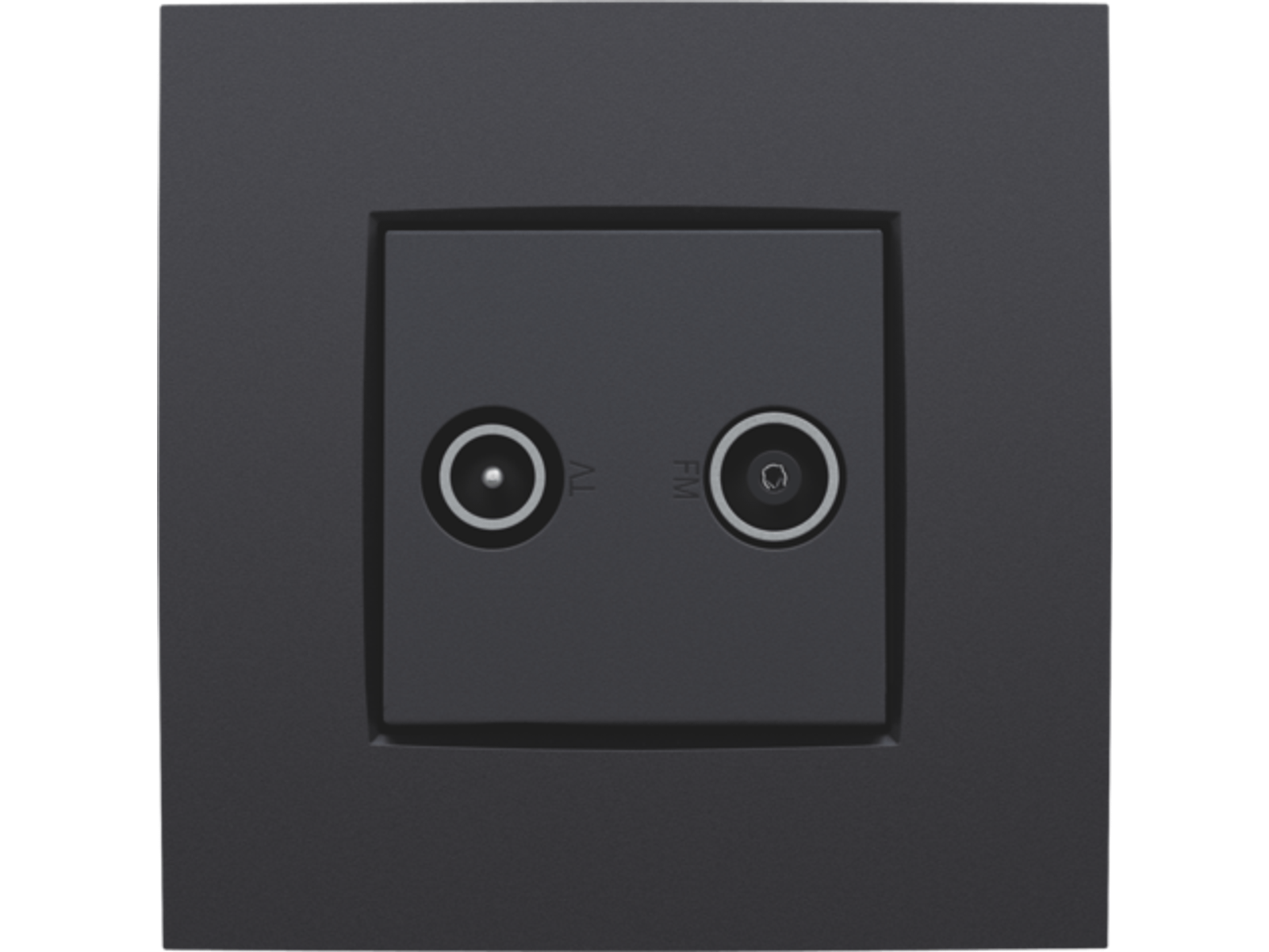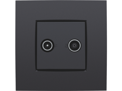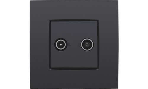 Centraalplaat met 2 enkelvoudige coaxaansluitingen. De eerste ingang is bestemd voor een EDU TV aansluiting. De tweede is bestemd voor FM Telenetr aansluiting. Beiden worden respectievelijk aangeduid met een TV en FM icoon. Afwerkingskleur: anthracite.