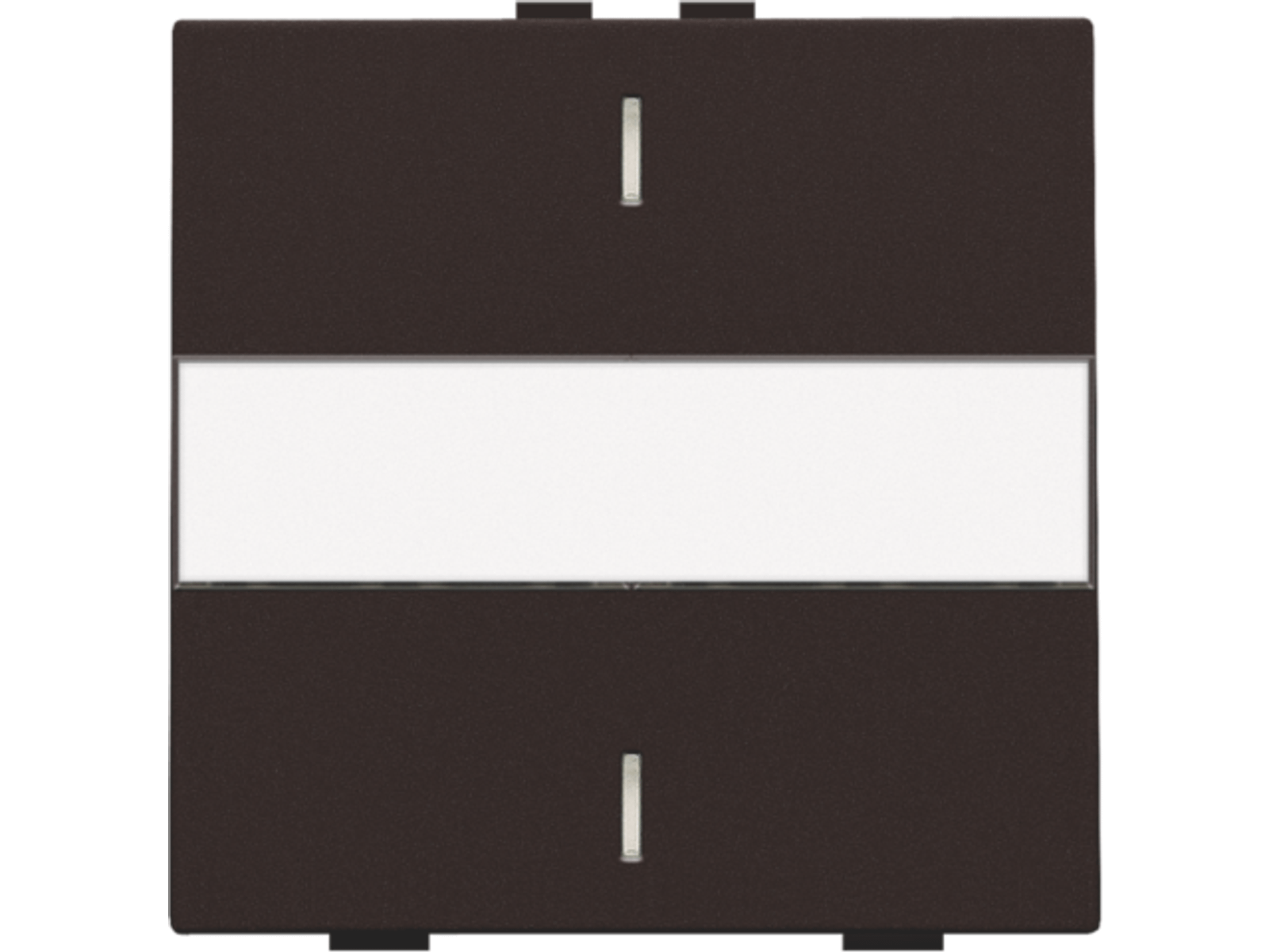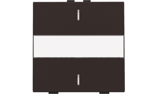 Enkelvoudige toets voor een busdrukknop met 2 bedieningsknoppen en 1 of 2 feedbackleds. De toets is voorzien van een tekstveld. Afwerkingskleur: dark brown.