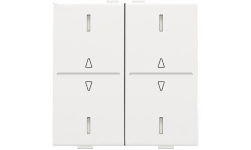 Een tweevoudige toets met Led en symbool 'op' en 'neer', voor een busdrukknop. Het ledlampje duidt aan wanneer een functie al dan niet geactiveerd is. Afwerkingskleur: white coated.