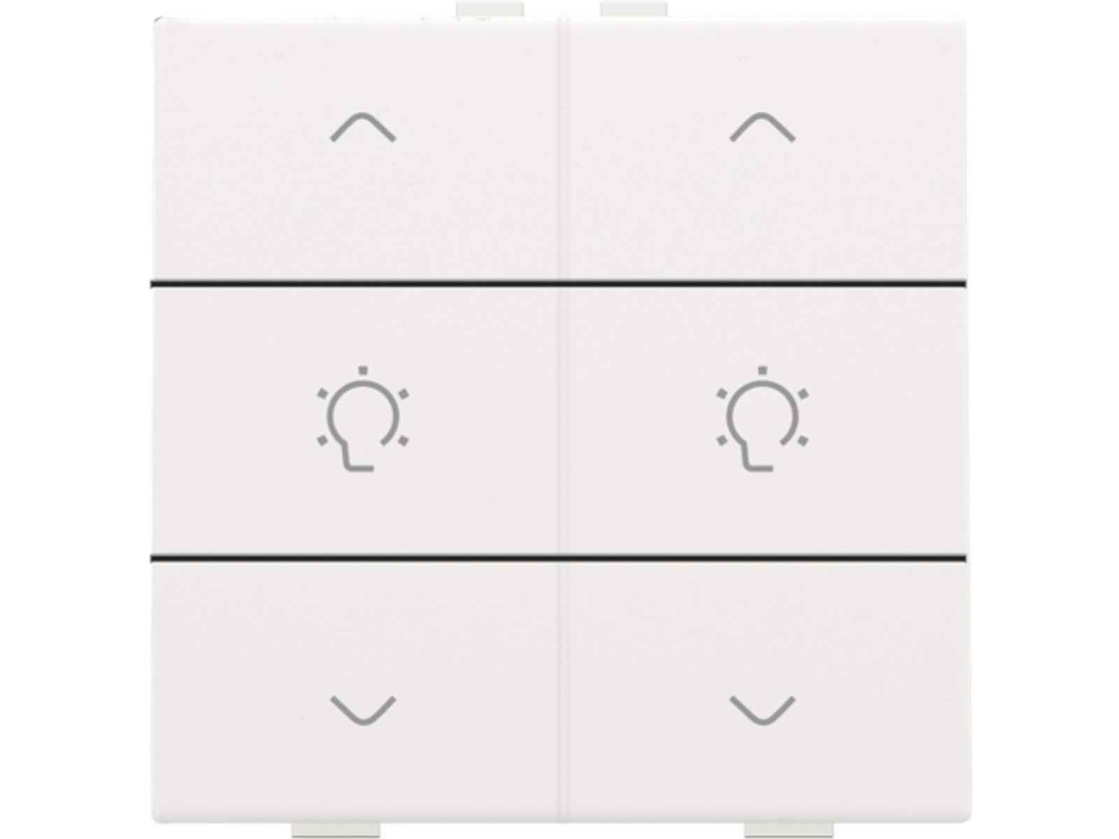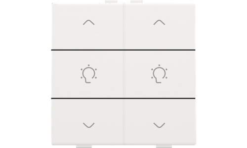 Met deze drukknop dim je twee lichtpunten of lichtkringen. Hij wordt via een klikmechanisme op de muurprint bevestigd. Mechanisme inclusief toets. Afwerkingskleur: white coated.