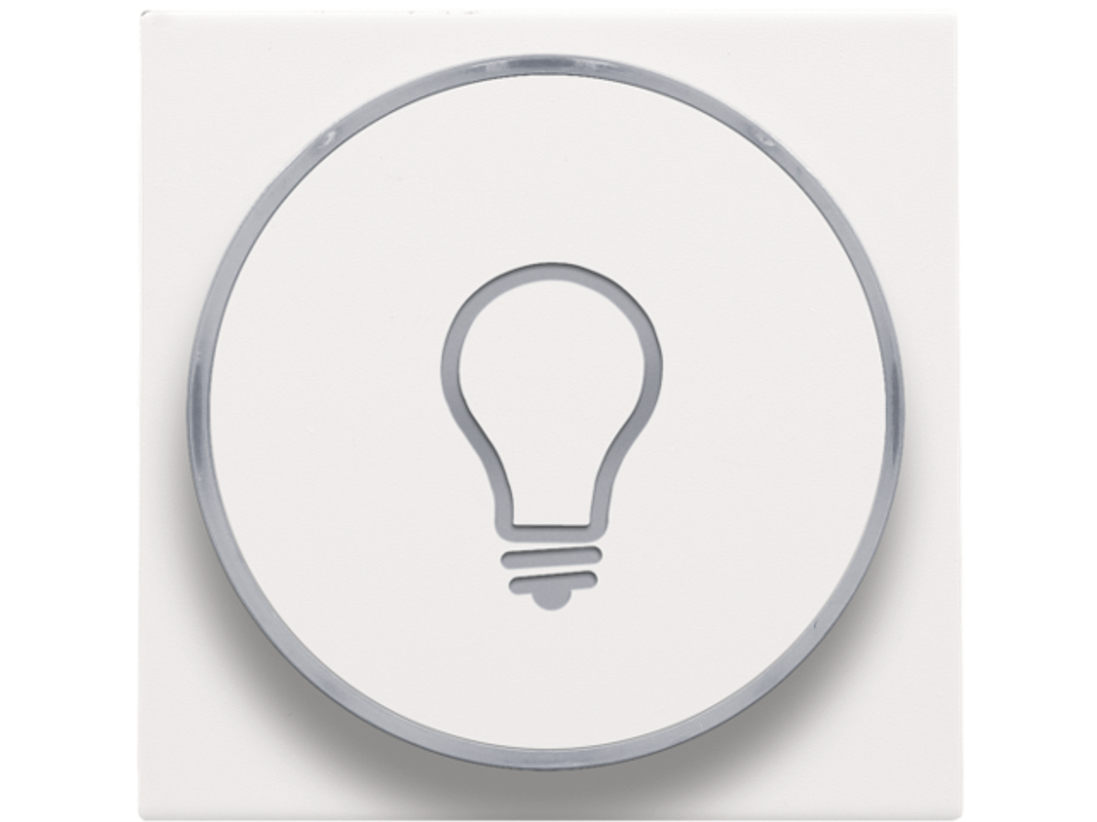 Centraalplaat met doorschijnende ring voor drukknop. De zijring met lampicoon laat toe dat de amberkleurige led aangeeft wanneer het licht geactivieerd is. Het kan ook als een soort signaallamp gebruikt worden. Afwerkingskleur: white coated.