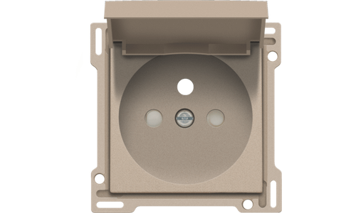 Centraalplaat voor inbouwstopcontact met penaarde, beschermingsafsluiters en klapdeksel. Deze centraalplaat dient gebruikt te worden op een stopcontact met inbouwdiepte van 28,5mm. Afwerkingskleur: champagne coated.
