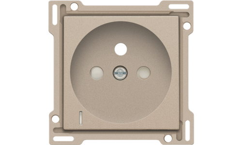 Centraalplaat voor inbouwstopcontact met penaarde, beschermingsafsluiters en klapdeksel. Deze centraalplaat dient gebruikt te worden op een stopcontact met spanningsaanduiding en met een inbouwdiepte van 28,5mm. Afwerkingskleur: champagne coated.