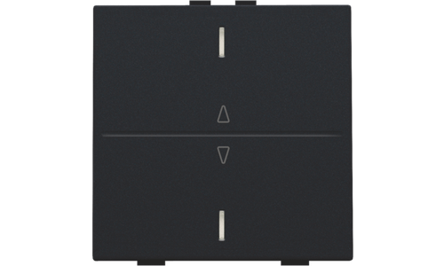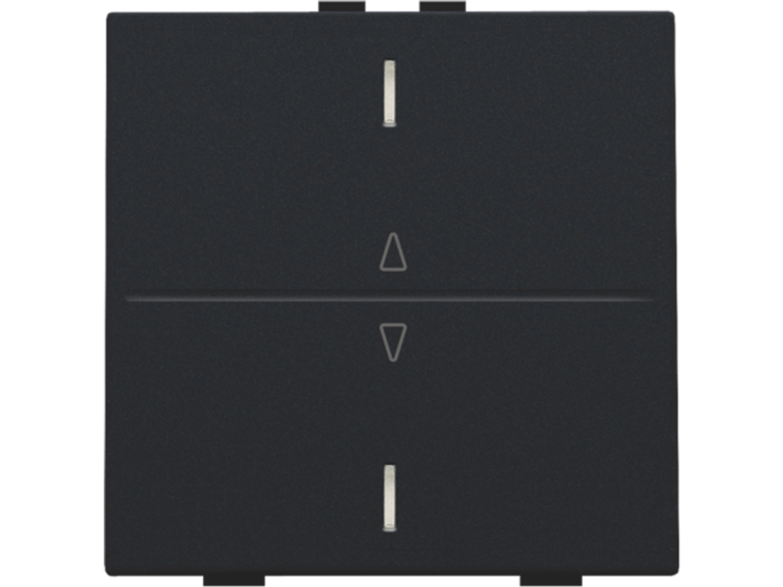 Enkelvoudige toets voor een busdrukknop met 2 bedieningsknoppen en 1 of 2 feedbackleds. De toets is voorzien van pijltjes 'op' en 'neer'. Afwerkingskleur: black coated.
