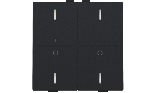 Tweevoudige toets voor een busdrukknop met 4 bedieningsknoppen en 4 feedbackleds. De toets is voorzien van een opdruk 'I' en '0'. Afwerkingskleur: black coated.