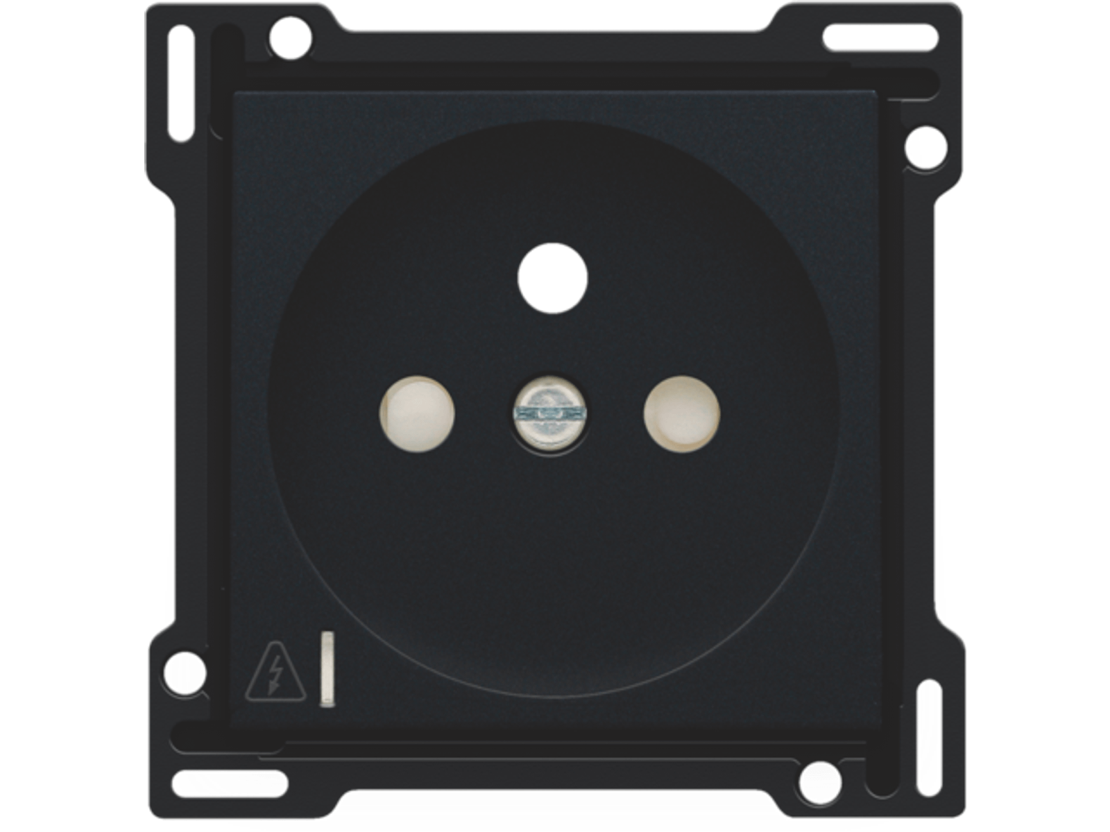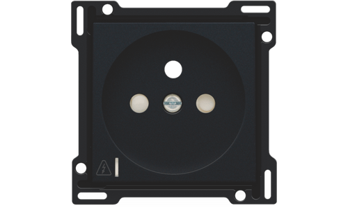 Centraalplaat voor inbouwstopcontact met penaarde, beschermingsafsluiters en klapdeksel. Deze centraalplaat dient gebruikt te worden op een stopcontact met overspanningsbeveiliging en met een inbouwdiepte van 28,5mm. Afwerkingskleur: black coated.
