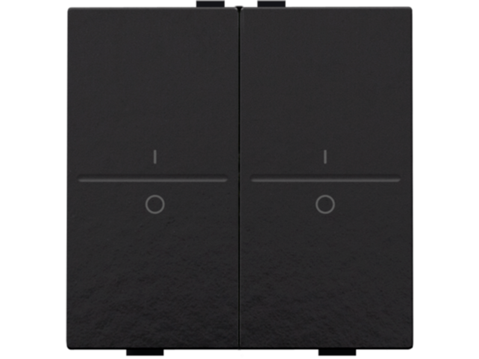 Een tweevoudige toets met symbool "I" en "0" voor een busdrukknop. Afwerkingskleur: Bakelite® piano black coated.