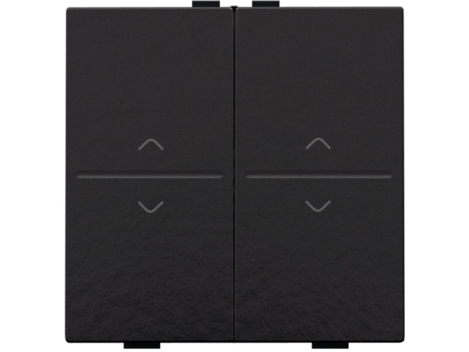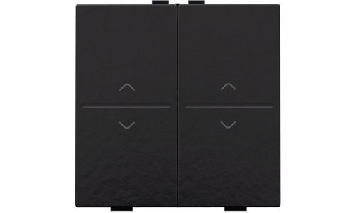Een tweevoudige toets met symbool op en neer, voor een busdrukknop. Afwerkingskleur: Bakelite® piano black coated.